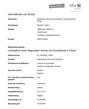 Detaillierte Infos zu den Anforderungsprofilen und zum Bewerbungsverfahren finden Sie unter https://www.lehrer-in-mv.de/